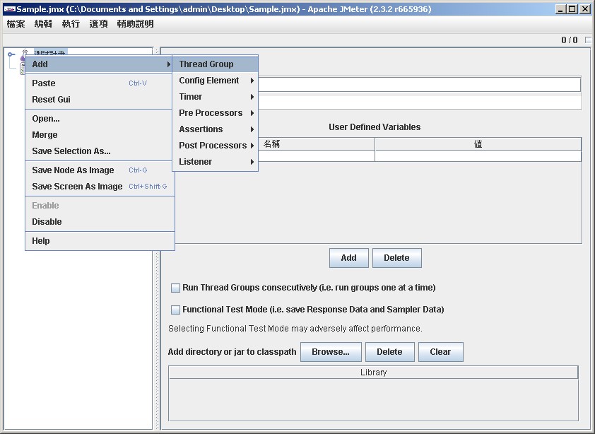 2.在【測試計畫】上按滑鼠右鍵 -> Add -> Thread Group