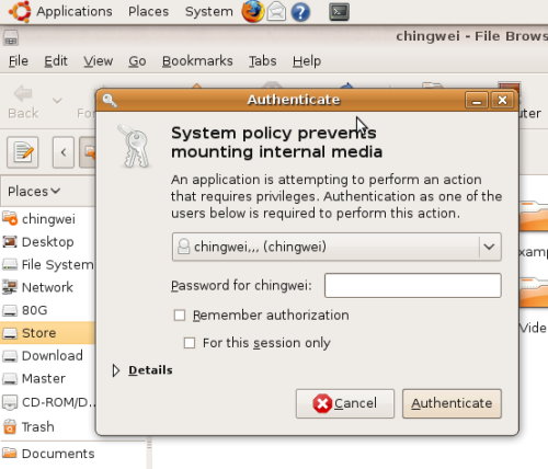 輸入chingwei的密碼,按Authenticate