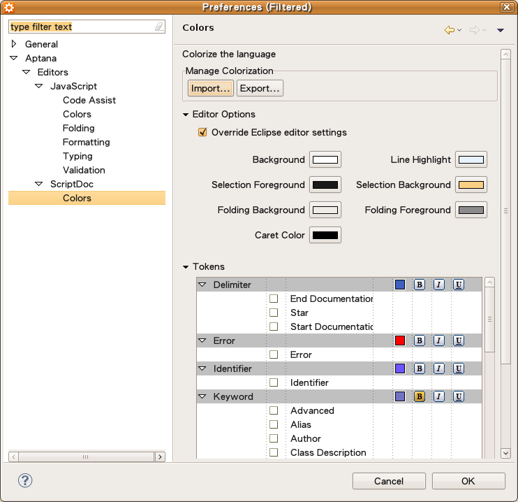 在 Aptana > Editors > PHP > Editing > Colors: PHPDoc 的畫面中,選擇 Import
